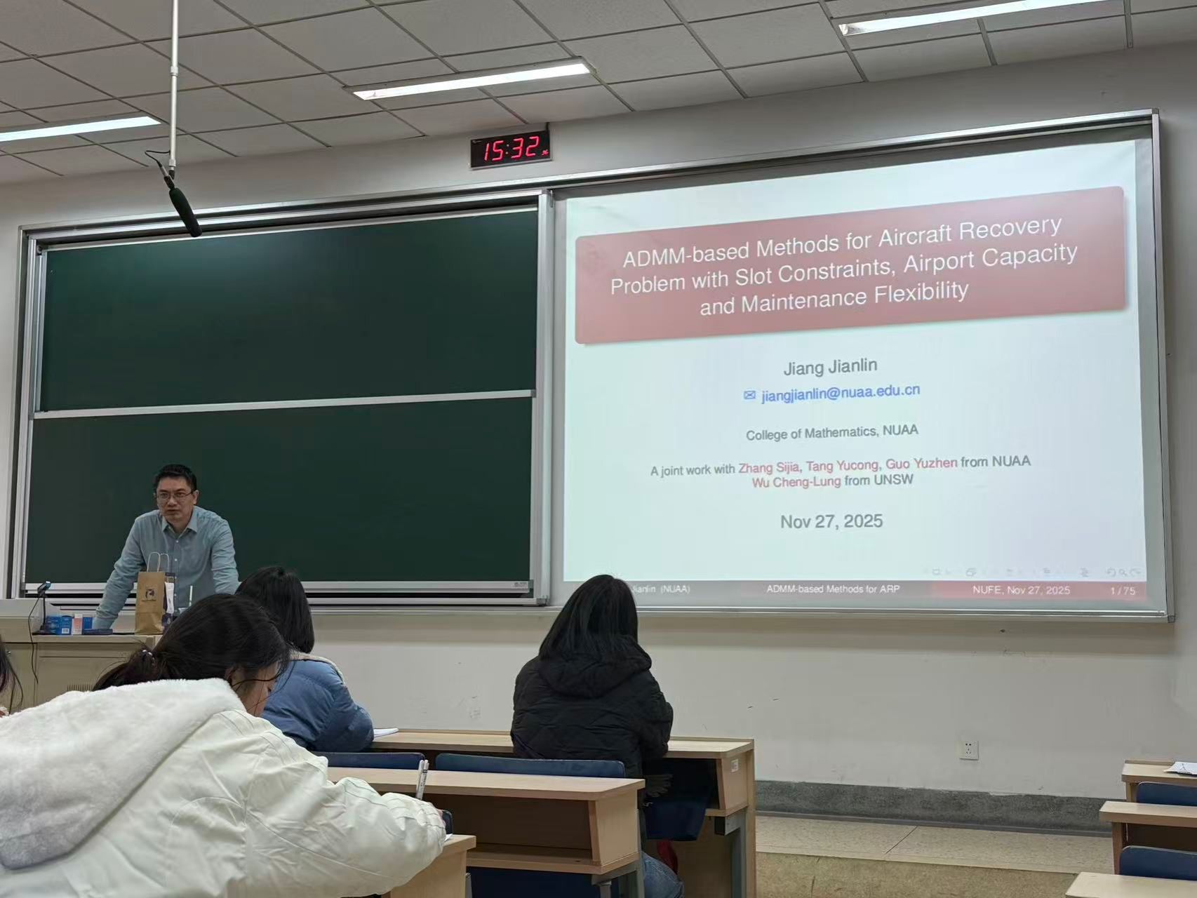 11月27日下午,应我院邀请,南京航空航天大学数学学院蒋建林教授在仙林校区德正楼111室作了题为“ADMM-based Methods for Aircraft Recovery Problem with Slot Constraints, Airport Capacity and Maintenance Flexibility”的学术讲座。我院相关教师和研究生参加了讲座。